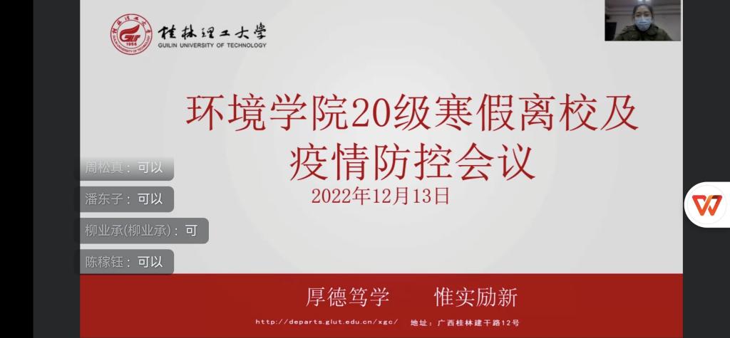 为切实增强学生的安全意识、自我防护能力和规避风险的能力,让同学们度过一个安全健康、愉悦和谐的假期。环境学院辅导员、班主任分别以年级、班级为单位,线上线下相结合的形式, 于12月13日晚,组织开展了2022年秋季学期本科生安全文明离校主题教育。