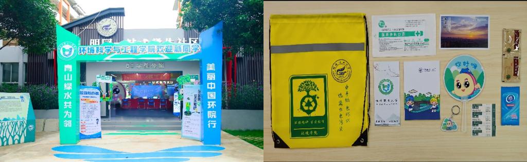 此外,学院以“绿色迎新”为主题,为新生设计制作了环保主题大礼包,包含环保袋、宣传页、蒲扇等物品,同时将迎新元素与专业特色进行融合,以 “青山绿水共为邻,美丽中国环院行”为主题对迎新现场进行布置并设置部分环保科普游戏,为新生科普环保知识,将迎新工作与学科文化有效结合。