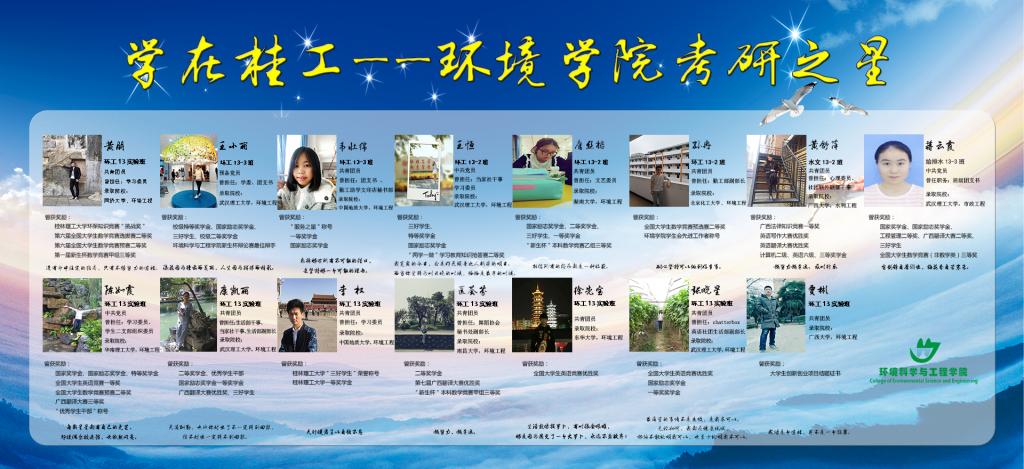 为表彰我院2017届本科毕业生在研究生考试中取得优异成绩,同时为我院广大学生树立榜样,我院于2017年5月2日起开展“学在桂工——环境学院考研之星”系列宣传活动。