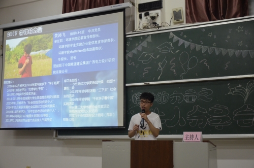 为提供我院学子与优秀毕业生交流的平台,进一步加强学院学风建设,2017年6月9日晚,我院于雁山校区05314教室举办了“榜样的力量——牛人分享会”。参加本次分享会并发表演讲的优秀毕业生分别是黄沛飞、何苗、唐丝裙、陆峣以及谢雨杏同学。
