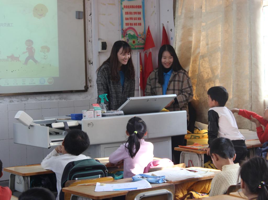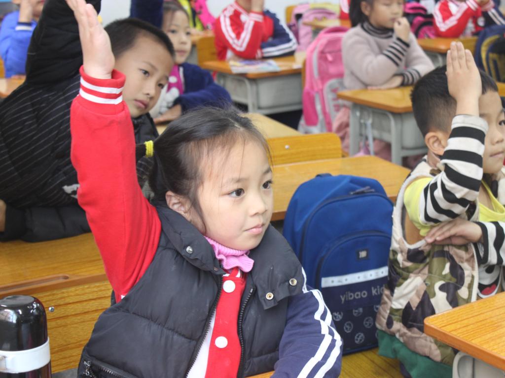 当天下午两点,学生志愿队伍到达君武小学。经过简单的熟悉校园和任务分配后,本次支教活动有序拉开序幕。志愿者分成了四组队伍,分别面向一年级1班,一年级3班,三年级1班和四年级2班。开始时,小朋友们略显羞涩,在志愿者讲解环保PPT并一起观看环保动画视频后,小朋友们热情高涨,与志愿者们的相处更加融洽。随后,志愿者们对小朋友进行了一问一答的环保知识游戏,对回答问题的小朋友分发了小礼品。在举手抢答的过程中,小朋友们对垃圾分类、保护环境有了进一步的认知,学到了丰富的环保知识,课堂氛围融洽。为使我院的环保理念“袋袋”相传,志愿者们发放了我院专属环保小黄袋,并和小朋友们进行了合影留念。