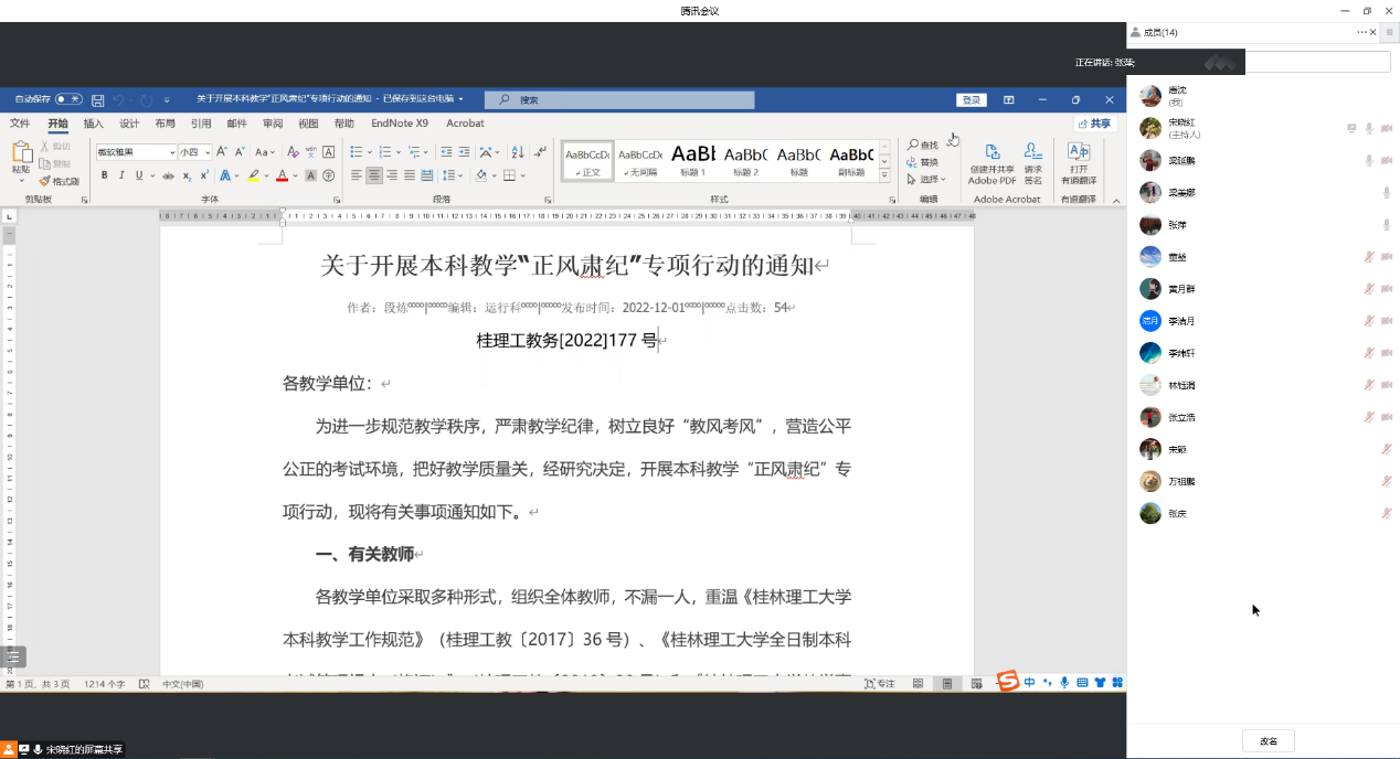 根据桂理工教务[2022]177号文件的精神,全体实验教师通过线上会议,重新学习了学校关于本科教学工作相关的规章制度。在教学工作方面,进一步强调教学工作规范,要求严格按时上课,持续提高教学质量。在学生考试监考方面,要明确监考职责,严格按照监考的相关规定执行,强调考场纪律,确保考试过程和评卷的公平公正。