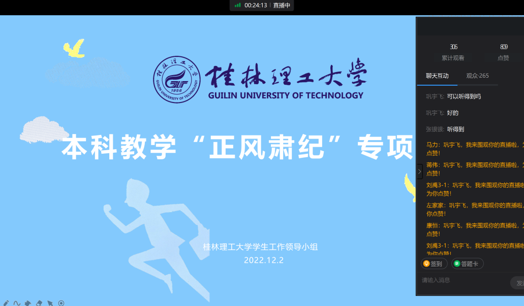 专任教师集中学习了《桂林理工大学本科教学工作规范》(桂理工教〔2017〕36号)、《桂林理工大学全日制本科考试管理规定(修订)》(桂理工教〔2019〕20号)和《桂林理工大学教学事故认定与处理办法》(桂理工教〔2010〕3号)等规章制度。学生通过召开主题班会等形式重温了《桂林理工大学学生学习管理规定》(桂理工教〔2009〕27号)、《桂林理工大学全日制本科考试管理规定(修订)》(桂理工教〔2019〕20号)等规章制度。通过开展此次专项行动,教师的教学工作规范意识进一步加强。学生的上课迟到早退减少,考试无作弊现象,学习气氛更加浓厚。 环境学院“正风肃纪”专项行动取得了初步的效果。