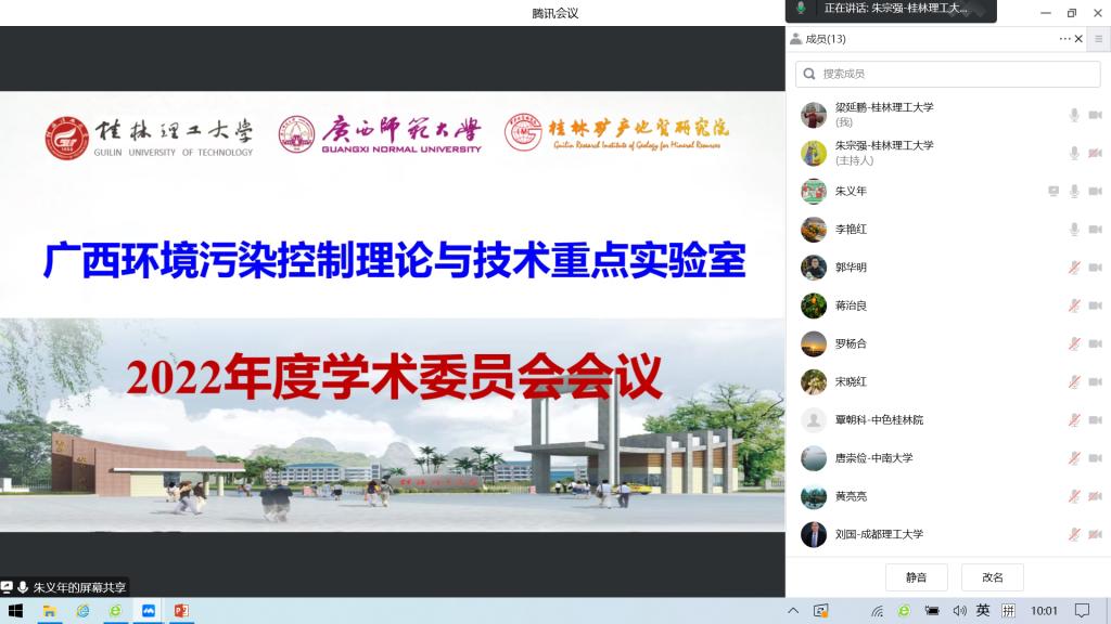 2023年1月12日上午,广西环境污染控制理论与技术重点实验室通过腾讯会议以线上方式召开了2022年度学术委员会会议。重点实验室学术委员会委员中国地质大学(北京)郭华明教授、清华大学刘锐平研究员、成都理工大学刘国教授、中南大学唐崇俭教授和贺州学院罗杨合教授以及重点实验室三家依托单位的学术委员会成员出席了本次会议。本次会议由李艳红研究员主持。