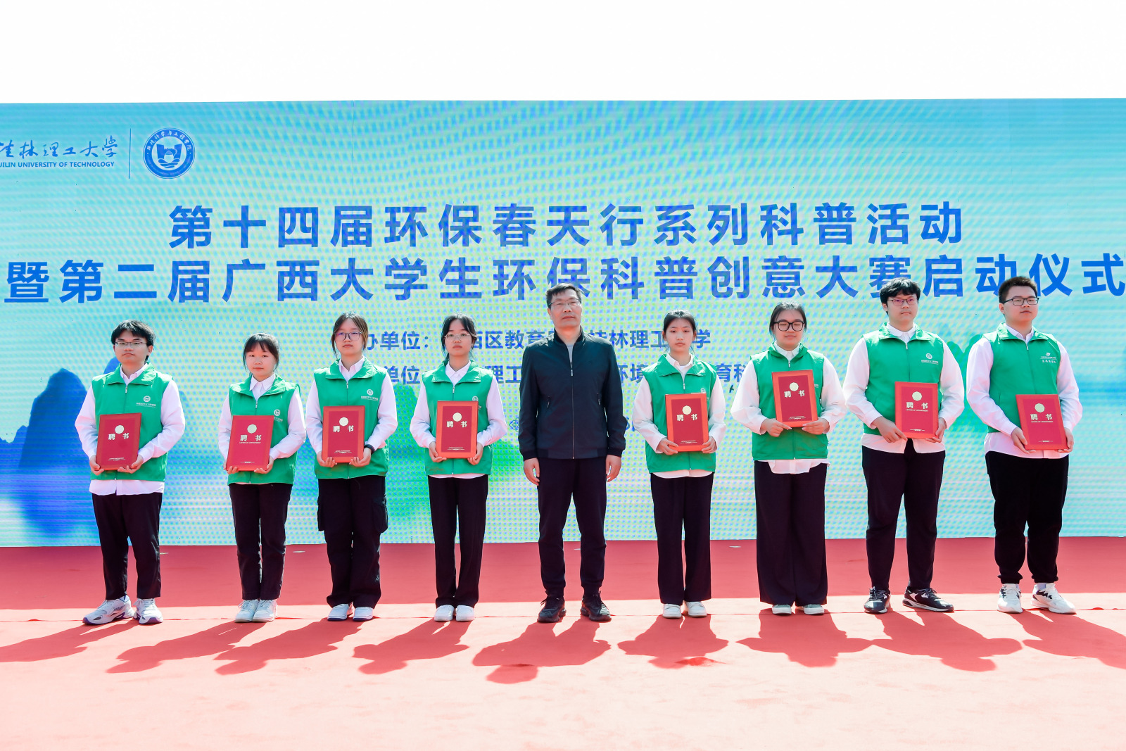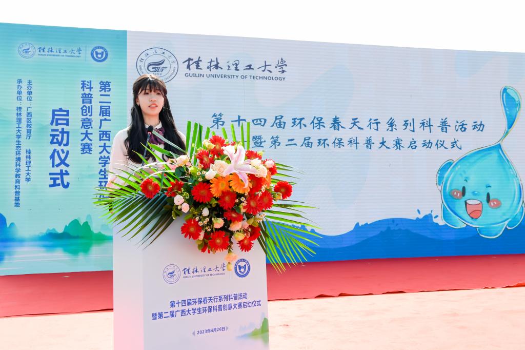 为积极宣传培育生态文明理念,践行习近平生态文明思想、提升大学生和广大市民环保知识素养,繁荣环保科普创作、促进环境科学知识的广泛传播、提升公民环境科学素质水平,4月26日,由广西壮族自治区教育厅和我校共同主办、我校生态环境科学教育科普基地承办的第十四届环保春天行系列科普活动暨第二届广西大学生环保科普创意大赛启动仪式在我校雁山校区15栋教学楼成功举办。学校党委副书记齐俊斌出席活动并在启动仪式上致辞。桂林市团市委学校部部长李楠,桂林市生态环境保护科学研究所所长文善华,桂林市科学技术协会学会部部长秦聪,广西师范大学、桂林电子科技大学、桂林航天工业学院相关代表,学校教务处、团委等部门负责人,100余名环境相关专业本科生代表,80余名小学生代表出席参加本次活动。