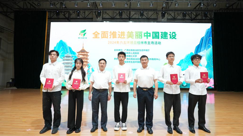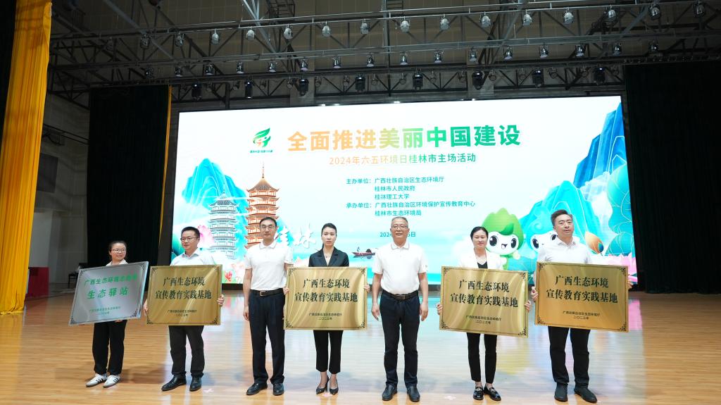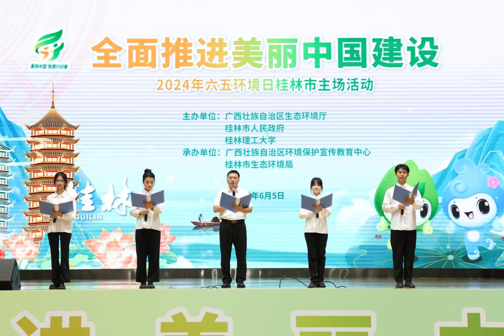 在第53个世界环境日到来之际,6月5日上午,由自治区生态环境厅、桂林市人民政府、桂林理工大学主办的全面推进美丽中国建设——2024年六五环境日桂林市主场活动在我校雁山校区综合体育馆举行。桂林市人民政府二级巡视员周作智,我校校长王敦球,党委常委、宣传部部长叶昊,桂林市生态环境局局长张晓阳,自治区桂林生态环境监测中心主任蒋永光出席活动,桂林市相关部门负责人,有关企业代表,获奖代表,我校相关部门负责人、师生代表,媒体记者,桂林市环保社会组织、环保志愿者代表约350余人参加本次活动。