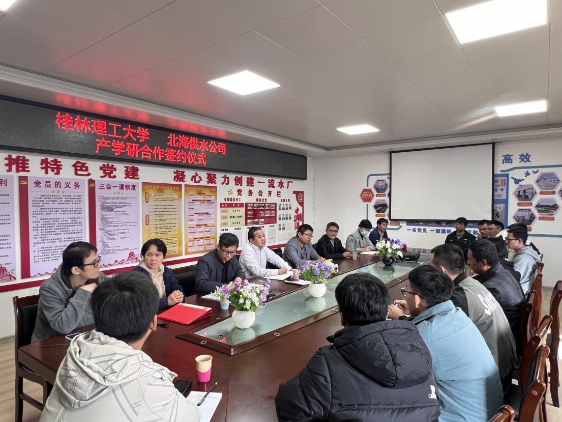 2024年12月24日下午,我院广西高校“双带头人”教师党支部书记工作室负责人李海翔副院长与北海市供水有限责任公司党支部开展了“党建引领推动产学研合作,助力供水事业高质量发展”座谈交流会。给水排水教研室赵文玉老师、北海市供水有限责任公司党政领导班子以及在该公司就职的桂林理工大学毕业生代表参加了会议。