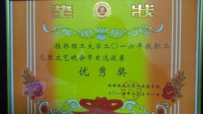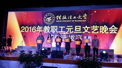 2015年12月11日晚,桂林理工大学屏风校区体育馆三楼灯火通明、歌声嘹亮,并不断地传了阵阵掌声,这里正举行桂林理工大学2016年教职工元旦文艺晚会选拔比赛。 我院选送的节目---歌曲串烧《我们一家人》在比赛中荣获优秀奖。由于期末工作繁忙,节目组成员黄月群、叶丽丽、宋晓红、宋海民、向彪、黄兆凡主要利用午休、晚上和周末时间见缝插针地抓紧排练,并得到了学院领导的大力支持,在较短时间内取得了比较良好的效果,最后在选拔比赛中取得了优异成绩,为学院争得了荣誉。