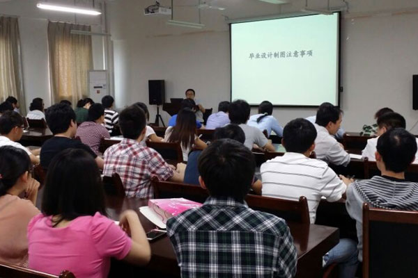 会上,张文杰博士详细介绍了污水处理厂/站的毕业设计图纸要求,从图纸的尺寸、图纸缩放比例、图纸绘制的线条、图纸的字体和字号等方面进行详细的介绍,并以工程制图实例指导2014届环境工程专业本科毕业生。廖雷教授对大气污染污染控制工程的设计进行了指导,从的图纸制作从工程制图和机械制图方面进行认真和详细的介绍,指出制图过程中应注意的事项,注重每个作图细节。肖瑜教授对固废处理工程项目设计的绘图标准与要求进行了指导。学生们经过指导后,对毕业设计的制图内容和设计深度要求有了详细和深刻的认识。此外,环境工程教研室将挑选一系列规范的设计图纸装裱好放在设计室供同学们参考。