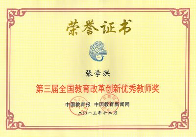 我校张学洪教授因主持了地方高校环境类特色人才培养和优质资源共享改革,努力建设具有地方特色优势的工程型人才培养基地,结合地方社会需求,整合优质教学资源,形成“重视基础、强化实践、突出特色”的工程应用型创新人才培养新方案荣获全国教育改革创新优秀教师奖。