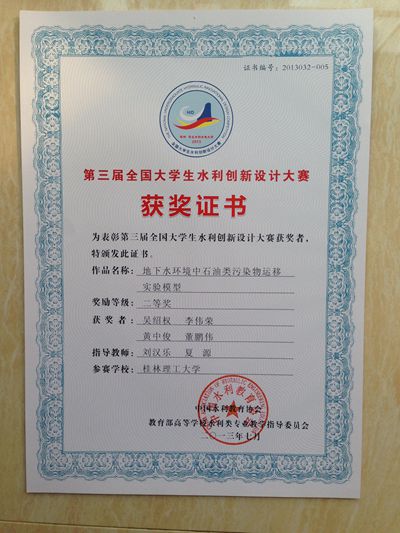 2013年7月28日-7月31日,中国水利教育协会、教育部高等学校水利类专业教学指导委员会主办、华北水利水电学院承办”第三届全国大学生水利创新设计大赛”。我校环境科学与工程学院选送的参赛作品《地下水环境中石油类污染物运移实验模型》在比赛中荣获全国“二等奖”, 指导老师为环境学院的刘汉乐博士、夏源博士,学生代表有水工10级的吴绍权、李伟荣、董鹏伟、黄中俊。