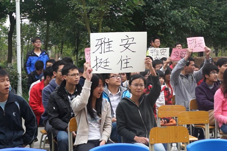 仪式开始前,参会师生自发制作了“雅安挺住”、“雅安加油”等标语为2013年4月20日8时发生7.0级地震的四川雅安祈福,并对逝者举行默哀仪式。震情深深牵动着全国人民的心,也牵动着会场全体师生的心。