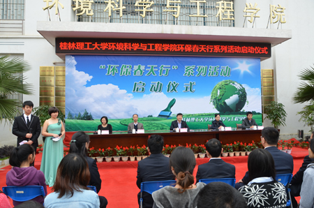 在第44个世界地球日到来之际,我院经过一个多月的精心筹备,于4月21日上午在雁山校区教九楼广场举行了 “环保春天行”系列活动启动仪式。学校校长解庆林、桂林市环境保护局党组成员刘学政、桂林团市委副书记魏艳、环境科学与工程学院院长曾鸿鹄、学校团委副书记周国桥以及环境科学与工程学院其他班子领导成员出席了仪式。参加此次活动的还有广西师范大学、桂林电子科技大学、桂林航天工业学院、桂林旅游高等专科学校、广西师范大学漓江学院等高校的学生代表。