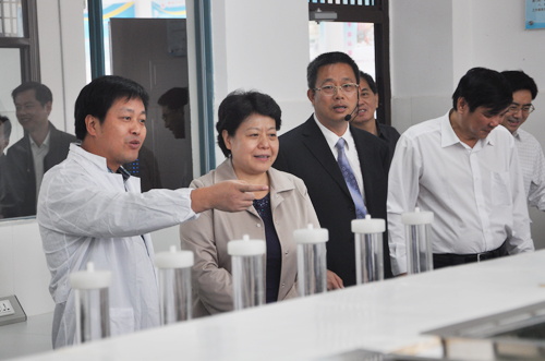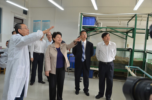 李康副主席一行参观考察了我院水污染控制国家级实验教学示范中心、环境污染与植物修复实验室植物培育基地及下设的环境地球化学实验室、地下污染物控制与模拟处理实验室、生活污水模拟处理实验室等功能实验室,对我院环境科学与工程学科博士点建设凝练出的有色金属矿区环境污染与生态修复、水污染控制技术、岩溶区环境地球化学与水资源保护、环境分析理论与技术四个研究方向给予了高度评价,赞赏这四个方向很有特色。在环境污染与植物修复实验室植物培育基地,李康副主席详细地询问了环境修复植物“李氏禾”的生长分布情况及对铬等重金属的吸附情况。当得知广西的气候条件很利于“李氏禾”的生长时,李康副主席高兴地说:“环境保护非常重要。广西工业需要发展,环境污染就必须及时治理,不然会出大问题,这个基地非常好,要好好做下去。”