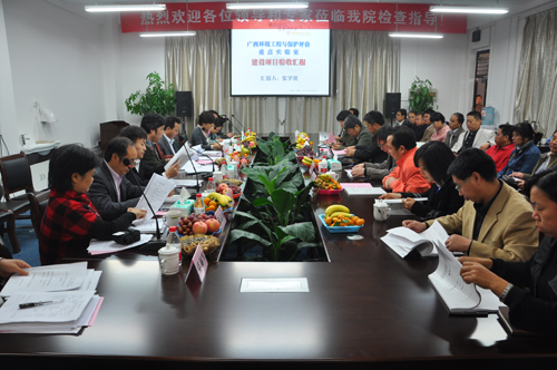 11月12日上午,由自治区科技厅组织的 “广西环境工程与保护评价重点实验室建设项目”验收工作会议在我院雁山校区教九楼二楼会议室召开。自治区科技厅基础处处长陈丹主持验收工作会议,以华南理工大学党志教授为组长的7位专家对项目(桂科能07109002、桂科能0842007、09-007-07)进行会议验收,学校校长张学洪教授致欢迎词,校科技处、学院卢英书记、曾鸿鹄副院长、朱义年副院长、方荣杰副院长、各学科带头人以及部分教师出席了验收会议。