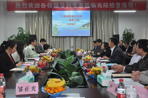 专家组在听取汇报后对实验室进行实地考察,查看有关材料,围绕重点实验室(重点学科)在总体定位与发展规划、研究水平与创新能力、队伍建设和人才培养、研究平台与使用效率、学术交流与运行管理以及社会服务等方面进行了探讨并形成评估意见。专家组认为我院此次接受评估的高校重点实验室和重点学科建设成绩突出,为广西人才培养、科技服务做出了巨大贡献。教育厅科研处傅源方副处长充分肯定了我院学科建设、实验室建设建设成绩,并对此次评估的重点实验室(重点学科)以后发展做了重要指示。