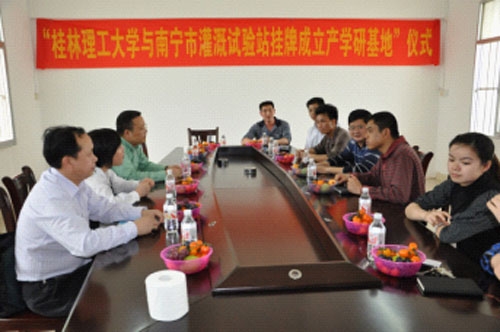 王敦球院长一行受到南宁市灌溉试验站的热情接待,双方就产学研合作事宜进行了深入的商谈,并为教学实习科研实践基地揭牌,参加揭牌仪式的还有南宁市灌溉试验站站长冯礼就、南宁市水利局办公室秘书卢明发、南宁市灌溉试验站技术骨干莫凡高工、谭文艳工程师、陶慧华助工等。