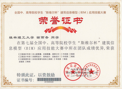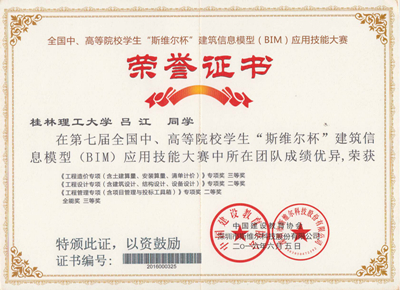 2016年6月3日-8日,第七届全国中、高等院校学生“斯维尔杯”建筑信息模型(BIM)应用技能大赛分别在四川大学、山东建筑科技大学举行,本届比赛共有432所高校代表队的参与了本次比赛的角逐,经过专家组的认真评审与我校学子优秀竞答,我校环境科学与工程学院徐佳维等5名同学组成的“小霸王学习机”代表队分别获《工程设计专项(含建筑设计、结构设计、设备设计)》和《工程管理专项(含项目管理与投标工具箱)》2个全国专项二等奖,《工程造价专项(含土建算量、安装算量、清单计价)》全国专项三等奖和1个 全能三等奖的好成绩,并获得了本届比赛的优秀组织奖。