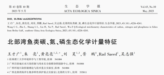 论文推荐│北部湾鱼类碳、氮、磷生态化学计量特征