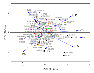 北部湾鱼类与碳、氮、磷元素含量和比值之间的主成分分析(PCA)图