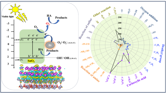 腐殖酸(HA)是一种典型的难降解有机物,广泛存在于天然水体和多种类型的废水中。本研究通过简单的一步水热法合成了Bi/SnO2复合材料,用于光催化降解HA。由于Bi的表面等离子体共振(SPR)效应,与纯SnO2相比,Bi/SnO2复合材料的光吸收从紫外光扩展到可见光。在可见光照射120 min后,UV254去除率达到93.58%,色度(CN)去除率达到94.41 %。Bi/SnO2(0.0178min-1)的降解速率常数是SnO2(0.0012min-1)的14.83倍,表明Bi/SnO2复合材料具有更高的光催化降解效率。傅里叶变换离子回旋共振质谱(FT-ICR MS)发现,光催化主要降解了大部分含CHO的有机物,减少了有机物分子数(从7240到3886)。m/z为400~500和500~600的有机物分子数明显减少,分别减少了1052和770。这表明光催化过程有效地降解了低分子量和中等分子量的有机物。溶解性有机质(DOM)的分子数、芳香度和分子量的降低主要通过羧酸反应、脱烷基反应和氧加成反应。DFT计算结果表明,e−从Bi转移到SnO2。自由基捕获和EPR分析表明,·O2−是光催化反应降解HA的主要活性物质。e−与催化剂表面吸附的O2发生反应,产生了丰富的·O2−,有效地降解HA,提高了其降解效率。经过4次循环后,Bi/SnO2光催化降解HA的效果变化不大,而XRD和FTIR分析发现循环前后的材料变化不大,表明材料具有稳定性。本研究提出了一种具有良好活性、可回收性和重复使用性的Bi/SnO2光催化材料的合成方法,并为了解光催化降解HA过程中DOM的分子转化提供参考。
