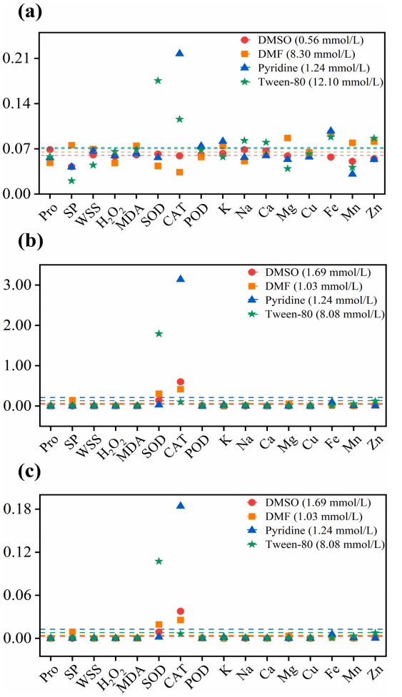 本研究针对植物毒理实验中常用的四种有机助溶剂:二甲基亚砜(DMSO)、二甲基甲酰胺(DMF)、吡啶(Pyridine)和吐温-80(Tween-80),系统考察了其对水稻幼苗的生理生化响应及对矿质元素吸收分布的影响,涵盖脯氨酸、可溶性蛋白、可溶性糖、过氧化氢、丙二醛含量以及SOD、CAT、POD等酶活性和K、Na、Ca、Mg、Cu、Fe、Mn、Zn等元素在内的16项指标。结果表明,这些助溶剂在不同浓度下对水稻产生差异化且具有组织特异性的毒性作用,并显著影响了矿质元素的吸收与分布。