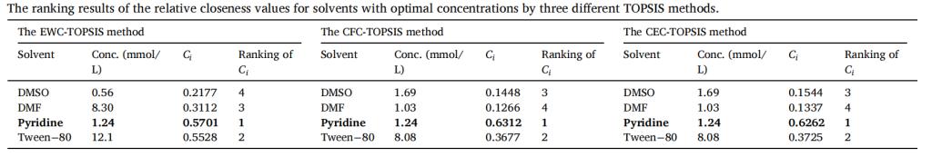 为科学选择毒性较低的最佳助溶剂,该团队引入多指标决策分析方法:TOPSIS,并结合熵权系数(EWCs)、贡献因子系数(CFCs)及综合有效系数(CECs)进行加权修正与评价。通过比较不同处理条件下的相对贴近度系数,研究发现在1.24 mmol/L浓度下的吡啶表现出最低毒性与最佳适配性,成为水稻毒理实验的最优助溶剂选择。