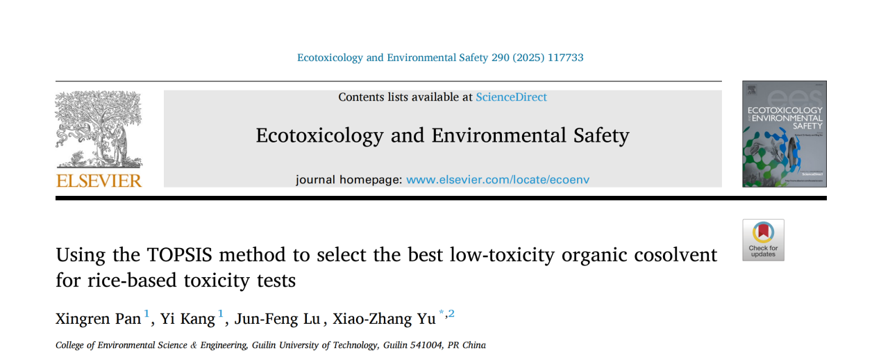 近日,在国际著名学术期刊Ecotoxicology and Environmental Safety上发表了题为“Using the TOPSIS method to select the best low-toxicity organic cosolvent for rice-based toxicity tests”的研究型论文,由我校环境科学与工程学院于晓章教授团队完成。我校潘星任、康艺为论文共同第一作者。该研究在优化植物毒理学试验条件、提升环境风险评估准确性方面取得了重要进展。