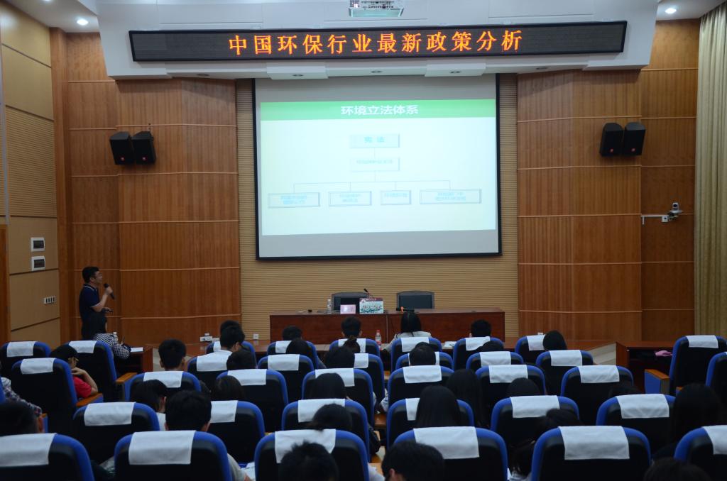 首先,向老师给同学们讲了一个关于环保局长自我忏悔的例子,通过这个例子告诫大家环境污染问题十分严峻,做环保工作要有事业心、有担当,不可帮助不良企业隐瞒不法行为。接下来,向老师向同学们普及了一下我国环境保护政策与法规,指出我国现在十分重视保护环境。他说,现如今环境污染日益严重,想要实现可持续发展政策,加大保护环境力度势在必行。其次,向老师向同学们介绍了新常态下的环境保护法,并详细的为同学们分析了最新环保法的主要特点。到了最后的互动环节,不仅同学们同向老师提出了困惑,唐老师与李老师也积极的同向老师交流了自己对环境方面的问题,向老师都一一详细的为他们解答。