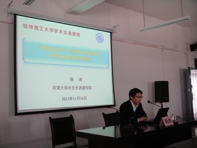 应我院邀请,2013年11月17日上午,河海大学水文水资源学院副院长、博士生导师杨涛教授到我校雁山校区12407室作了题为“气候变化条件下流域水文极端事件的响应机制和预测研究”的学术报告。环境科学与工程学院相关专业的教师及学生到场聆听了报告。