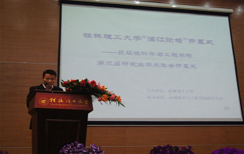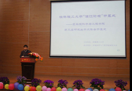 4月8日上午9:30,由桂林理工大学环境科学与工程学院承办的自治区研究生创新项目“漓江论坛”暨环境科学与工程学院第三届研究生学术年会开幕式在我校屏风校区图书馆科技报告厅隆重举行。学校研究生处程道品处长、环境科学与工程学院王敦球院长、学生工作处张雷副处长、地球科学学院庞保成副院长、环境科学与工程学院党委周章明副书记及环境科学与工程学院各学科带头人出席了开幕式。参加本次开幕式的还有广西桂林各大高校的研究生会代表。广西大学、广西师范大学、广西民族大学、桂林电子科技大学、广西艺术学院、广西师范学院、广西工学院等兄弟高校研究生会及桂林理工大学各兄弟系院研究生会纷纷发来贺电、送来条幅预祝本次开幕式取得圆满成功。