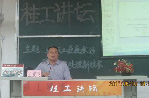 应我院邀请,6月10日上午,广西大学轻工与食品工程学院院长、博士生导师王双飞教授做客桂工讲坛,在雁山校区05103教室为师生作了一场题为“造纸工业废水污染特征及处理新技术”的学术报告。学院院长王敦球主持了此次报告会,学院党委副书记周章明、辅导员唐红兵等相关专业师生参加了此次报告会。