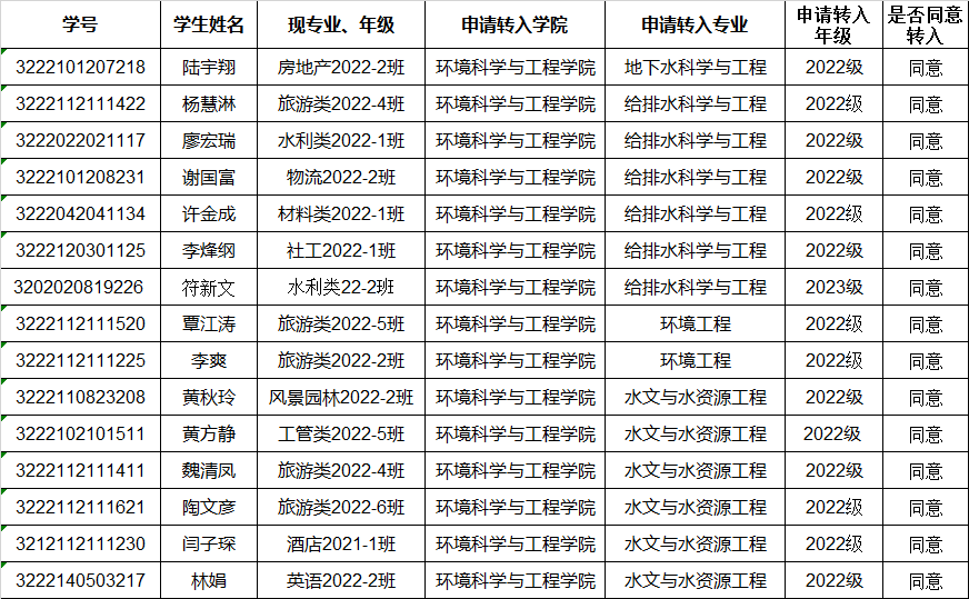 根据《桂林理工大学本科学生转换专业实施办法)》(桂理工教[2017]28号)及我院转换专业工作方案、我院各专业转入评价标准,经学生本人申请,我院各专业转入考核小组审核,拟同意以下学生转入我院。
