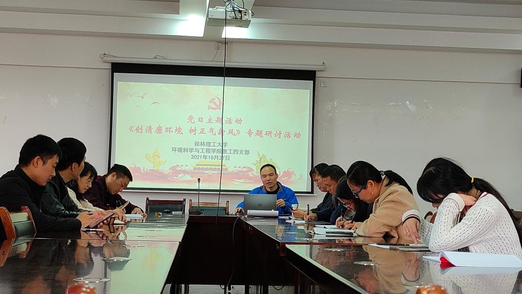 2021年10月27日,我院教工四支部在雁山校区12407会议室开展党日主题活动:《创清廉环境 树正气新风》专题研讨活动。本次党日活动由党支部书记梁延鹏主持,以“创清廉环境 树正气新风”为主题,重点以廉政教育、视频观看、案例研讨为内容,开展了“纪法同行”集中研讨与集体廉政教育。