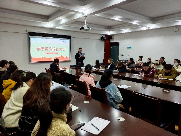 会议伊始,党支部书记岑韫同志向大家宣读预备党员转正的流程和会议纪律,纪检委员宇晓凌同志汇报出席的党员人数,确定出席人数符合组织规定,并宣布会议正式开始。六名预备党员依次上台宣读《转正申请书》,表明自己的入党动机,汇报成为预备党员一年以来自己在工作、学习、生活方面的表现和进步,进行了深刻的总结。然后由预备期期间的联系人发表意见,联系人对各个预备党员的情况进行简单汇报,表扬优点,指出不足的地方并提出建议,说明其是否符合一名中国共产党正式党员的要求。每位预备党员的情况汇报结束后,由现场的正式党员对他们进行提问。最后经过现场正式党员进行无记名投票,会议同意李嘉伟、张宇玲、徐薇、徐赫姝、李秋虹、郭蒂洁正式成为一名共产党员。