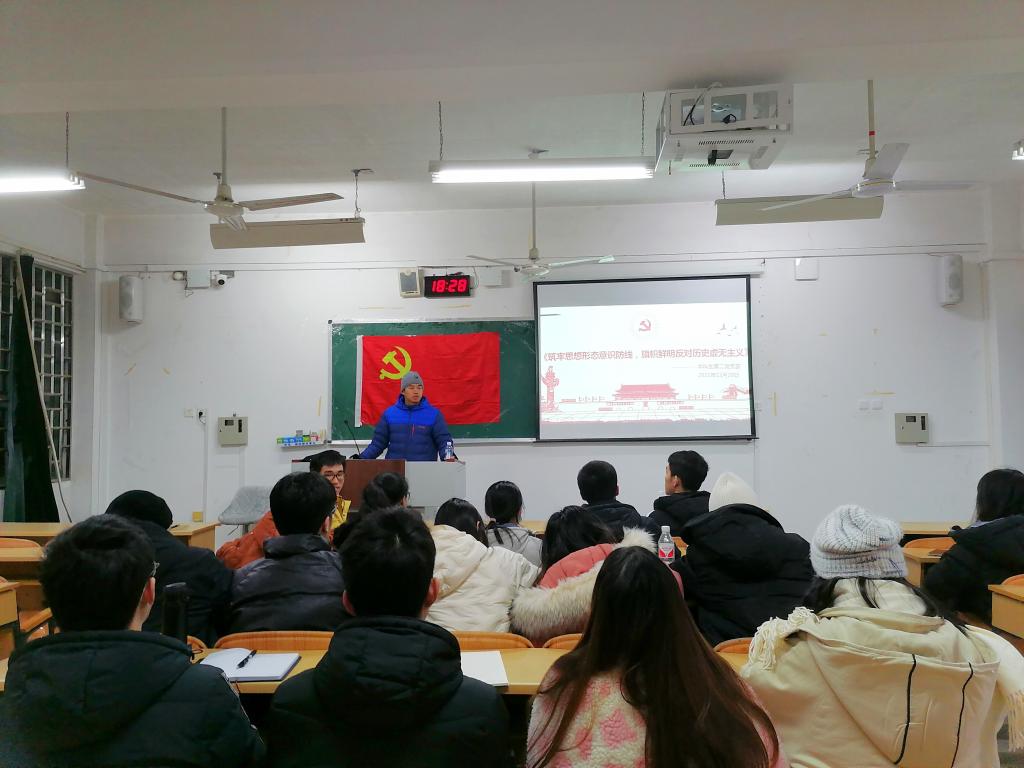 2021年12月29日,环境科学与工程学院本科生第二党支部于05302开展“铸牢思想形态意识防线,旗帜鲜明反对历史虚无主义”主题党课。本次党课由杨智钧同志主讲,支部部分党员及预备党员积极参加。