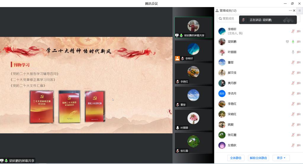 梁延鹏书记讲到:二十大全面总结了过去5年的工作和新时代10年的伟大变革,深人分析了国内国际形势,系统阐述了开辟马克思主义中国化时代化新境界、新时代新征程中国共产党的使命任务等重大理论和实践问题,科学谋划了未来5年乃至更长时期党和国家事业发展的目标任务和大政方针,选举产生了新一届中央领导集体,取得了一系列重大政治成果、理论成果、实践成果。二十大的成功召开,对于我们党在新时代新征程上团结带领全国各族人民全面建设社会主义现代化国家、全面推进中华民族伟大复兴,具有重大的现实意义和深远的历史意义,对于二十大精神,我们要全面系统学、沉浸身心悟、实实在在做。