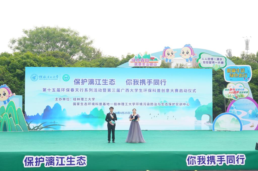 4月25日上午,在第三个桂林市“漓江保护日”到来之际,为深入贯彻落实习近平生态文明思想,提升广大青年学生环保意识,展现当代青年的环保担当与青春风采,由学校和国家生态环境科普基地—桂林理工大学环境污染防治与生态保护实训中心主办的“保护漓江生态,你我携手同行”第十五届环保春天行系列活动暨第三届广西大学生环保科普创意大赛启动仪式在雁山校区举行。学校党委常委、副校长王磊出席活动并致辞,党委常委、宣传部部长叶昊,校长助理、党办校办法务办主任张成龙,广西环境科学学会秘书长王晓飞,桂林市生态环境局、兴安县生态环境局有关领导,各兄弟院校相关领导和嘉宾、学校相关职能部门负责人出席活动,广西大学生环保科普创意大赛参赛代表以及桂林市大埠中心校师生代表参加活动。