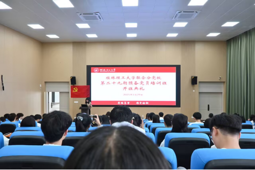2025年5月29日,环境科学与工程学院,物理与电子信息工程学院、数学与统计学院、艺术学院、商学院联合分党校第二十九期预备党员培训班暨第一讲在雁山校区03316报告厅顺利举行。五个学院党组织代表、教员及全体参训预备党员参加此次会议,本次会议由物理与电子信息工程学院党校教务员夏琳主持。