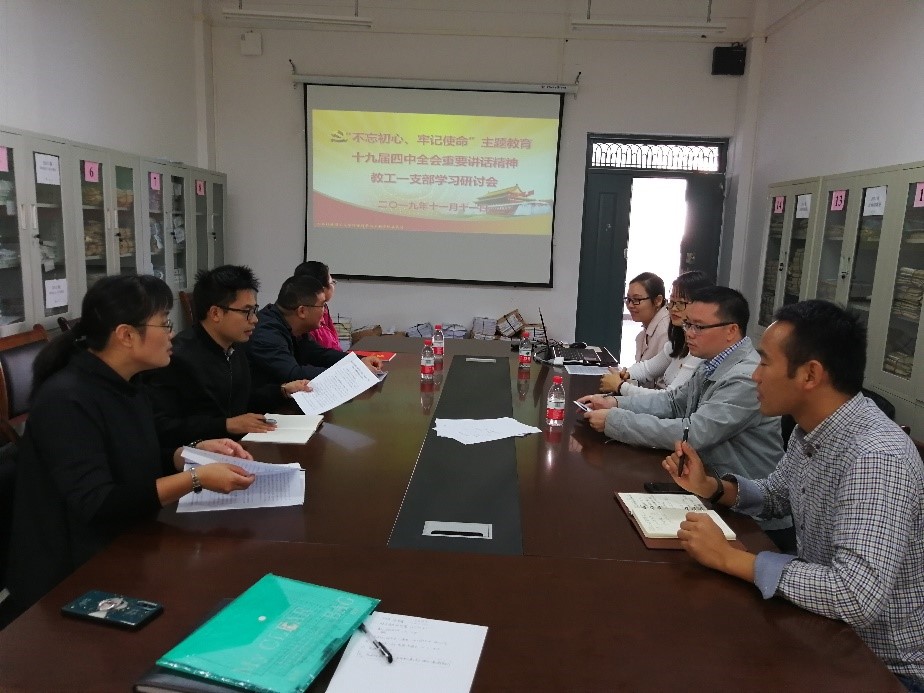 2019年11月12日,环境学院教工一支部在雁山校区12415会议室组织党课学习,学习主题开展“党的十九届四中全会精神”学习研讨会。本次会议由教工一支部书记夏源同志主持,学院副院长林华同志介绍了十九届四中全会公报的主要内容,传达了全会精神,并参与了讨论。