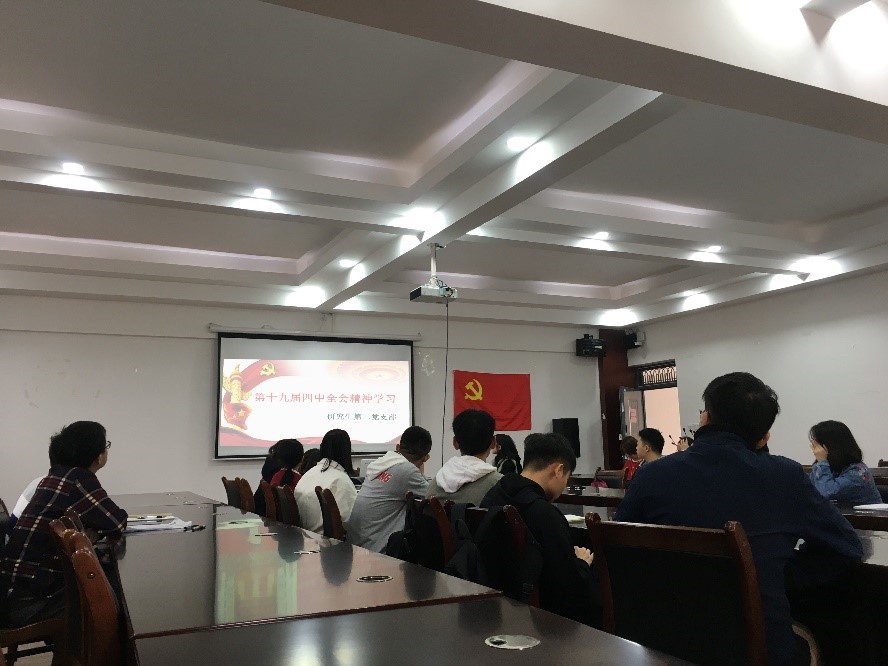 11月20日中午12:00,我院研究生二支部在雁山校区萃华楼12407会议室组织学习了十九届四中全会精神.党支部第一书记李楠老师主持会议,党支部全体党员同志参加会议。