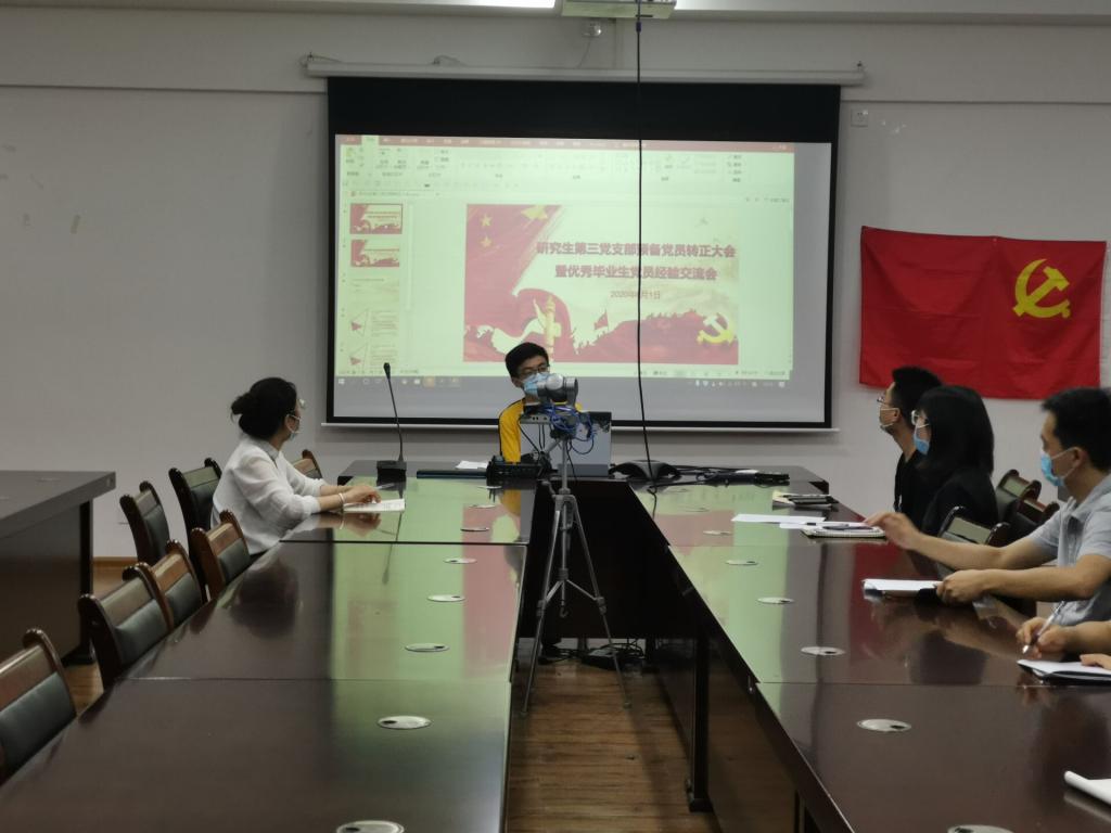 2020年6月1日,我院研究生第三党支部于雁山校区萃华楼12407室召开了预备党员转正大会暨优秀毕业生党员经验交流会,会议由支部副书记陈博主持,支部全体在校党员同志参加会议。本次大会讨论关于苑宇杭、邓乐2名预备党员转正的事宜。