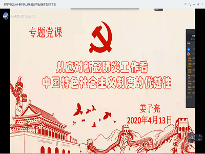 4月13日晚上,环境学院2020年春季学期入党积极分子培训班课程通过钉钉线上举行,学院党委书记姜子亮开展了“从应对新冠疫情肺炎工作看中国特色社会主义制度的优越性”的专题党课,培训班100余名学员聆听了党课报告。
