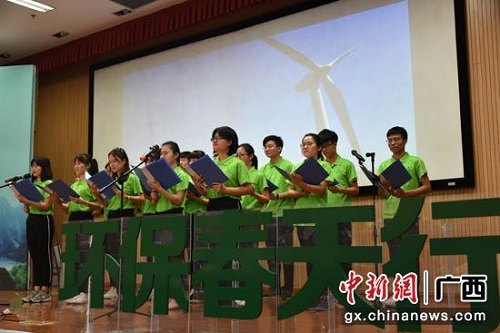 “让美景常在,让歌声永恒。每天拥抱雨后的彩虹……让生态平衡,让文明传承。让生态文明常驻在我们心中。”4月28日,在桂林理工大学雁山校区图书馆报告厅,一群身着绿色T恤的同学齐唱《生态文明之歌》。当天,该校绿色行动之“悦享生态 绿色校园”环境文化节暨第六届“环保春天行”系列活动举行启动仪式。