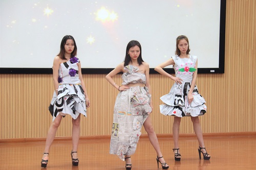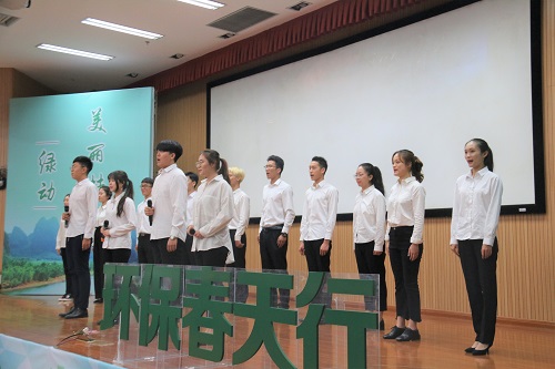 悦享生态文明,绿动美丽桂工。精彩的拉拉队表演“绿动桂工”拉开活动帷幕,现场观看了“环保春天行”系列活动的视频回顾、环保创新服装展示、《生态文明之歌》合唱表演、《今天我们这样爱国》朗诵。学生工作部部长张成龙和学院党委书记为“绿色校园”卡通形象大使--“环环”揭晓。它满载着桂工师生的深情与厚望,凝聚着桂林山水的灵秀与神韵,象征着自然,绿色和健康的生命力。校团委书记周国桥和学院副院长(主持工作)游少鸿把象征绿色,健康的环保袋发放给同学们,把环保精神“袋袋相传”。随后,学生代表发表环保倡议,呼吁大家从身边小事做起,在垃圾分类和环境保护方面贡献自己的力量。
