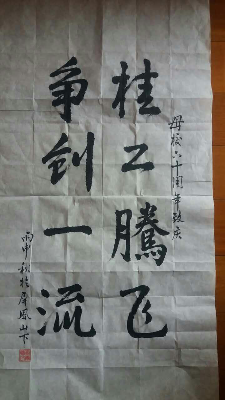 “作为退休老师呢,时间都是年轻人的,哈哈。他们需要更加努力。在我了解到的情况,我们院的老师都是很敬业的,学生也是很能干的,很多大学生创新成果也是有目共睹的。所以我预见我们环境学院的未来一定是越来越兴旺的。所以这次六十周年我题了一幅毛笔书法——“桂工腾飞,争创一流”,希望我们环境学院也能够腾飞,也应该争创一流。现在在广西是一流,以后在全国也能一流!”