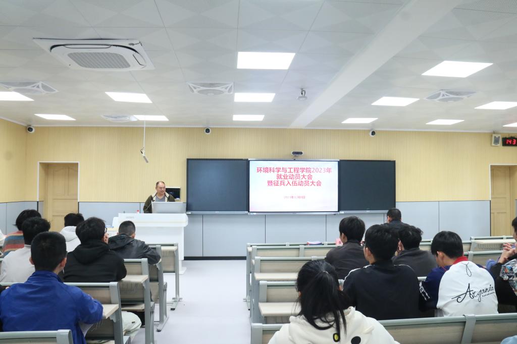 为积极响应国家的征兵号召,2023年12月8号,桂林理工大学环境科学与工程学院在雁山校区05606教室开展就业动员会暨征兵入伍动员会,动员会由学校党委武装部副部长、党委保卫处工作部副部长、保卫处副处长黄海同志主讲,同时出席本次动员会的还有环境科学与工程学院党委副书记叶大相同志以及相关负责老师。